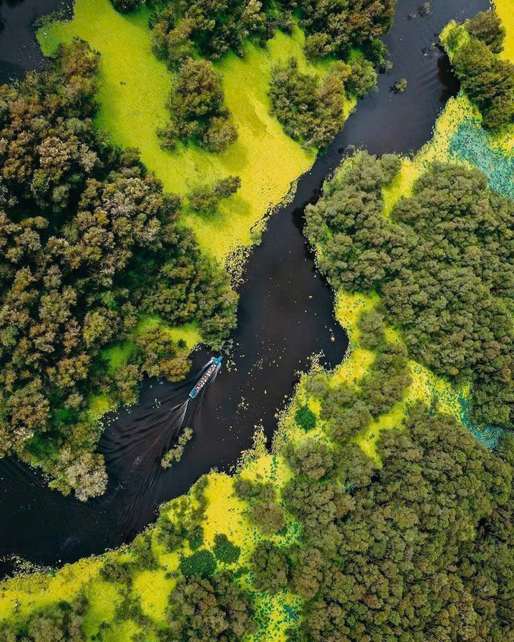 Rừng Tràm Trà Sư ở An Giang là khu rừng ngập nước tiêu biểu của miền Tây, nổi tiếng với vẻ đẹp hoang sơ, hệ sinh thái đa dạng, là nơi cư trú của nhiều loài chim quý hiếm, trở thành điểm du lịch sinh thái hấp dẫn, đặc biệt vào mùa nước nổi khi thảm bèo xanh phủ kín mặt nước, tạo nên khung cảnh huyền ảo và yên bình, nơi bạn có thể đi xuồng len lỏi qua kênh rạch để ngắm cảnh và khám phá thiên nhiên.